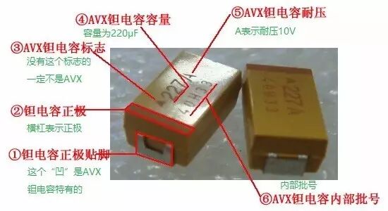 1. 钽电解电容焊脚形状,原装 AVX 钽电容焊脚正极跟负极不一样,正极的为“凹”型, 也就是凹进去的,负极的是“口”型。
