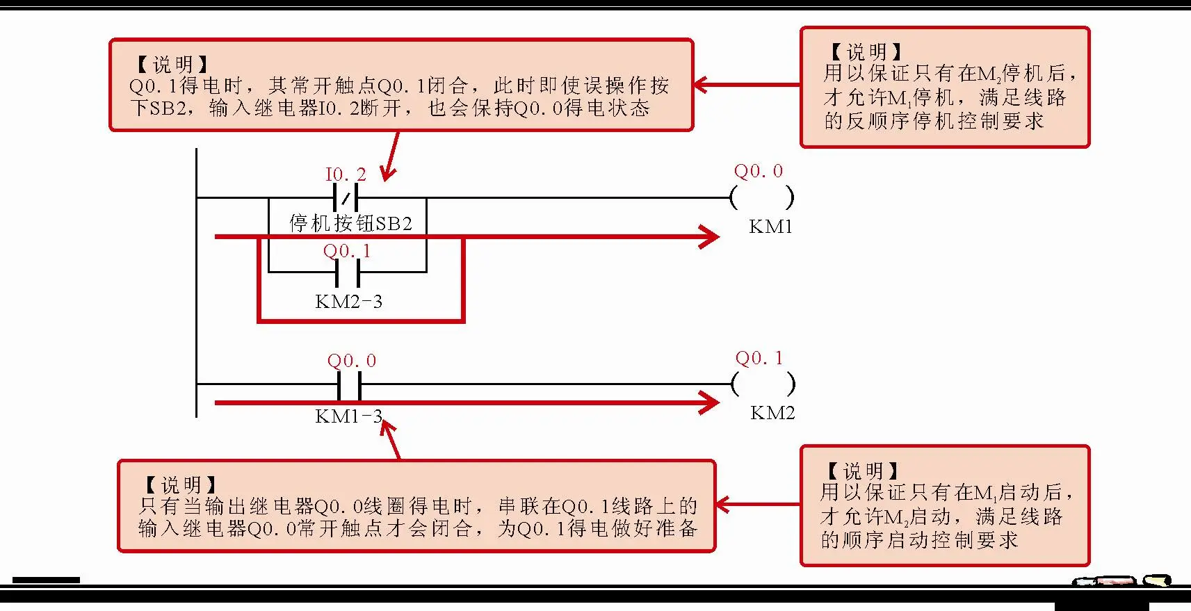 同时,为了防止当起动电动机M2时,误操作按动电动机M1的停止按钮SB2,而关断电动机M1,在电动机M1的起动控制线路中并入电动机M2交流接触器KM2的常开触点,实现联锁控制。