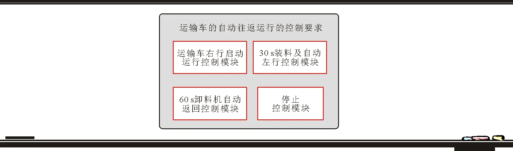 根据运输车的自动往返运行的控制要求,我们可以将功能模块划分为4部分,如下图所示。